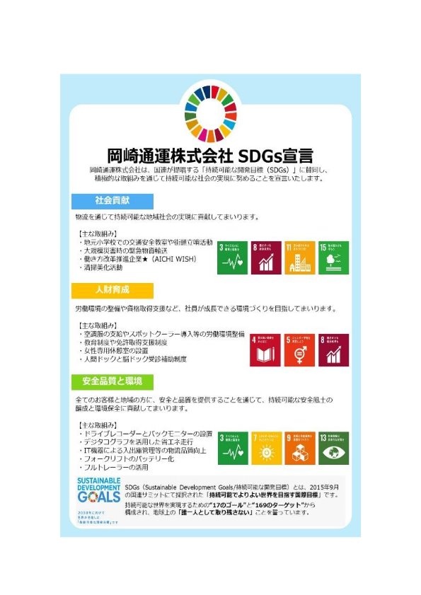 岡崎通運株式会社(本社:愛知県岡崎市、社長:天野保弘)は、国連が提唱する「持続可能な開発目標(SDGs )」に賛同し、積極的な取組みを通じて持続可能な社会の実現に努めることを宣言した。