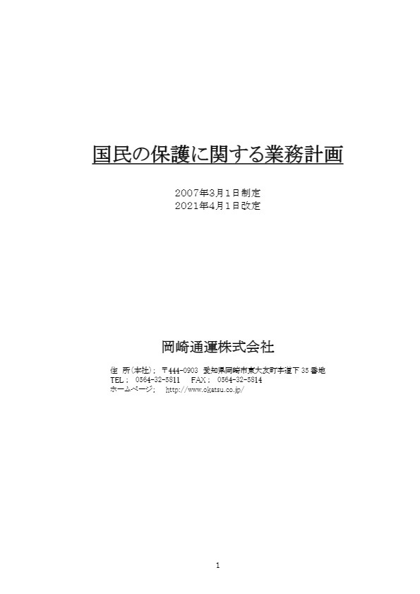 国民の保護に関する業務計画について 2021.05.27 岡崎通運は、武力攻撃事態等における国民の保護のための措置に関する法律(平成16年法律第112号)第36条第1項に基づき、国民の保護に関する業務計画を次のとおり定めています。