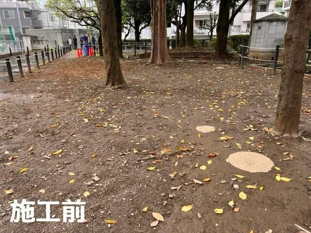 今回は平面への敷設だけでなく、元々あった敷石や木の根を活かした敷設が特徴です。
