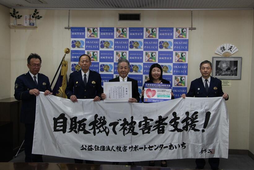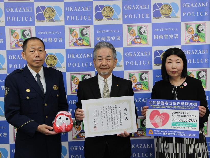 岡崎通運株式会社(本社:愛知県岡崎市、代表取締役:天野保弘)は犯罪被害者支援につながる寄付型自販機を愛知県内に17台設置しました。このことに対し、2024年4月25日に公益社団法人被害者サポートセンターあいち様より感謝状を贈呈いただきました。