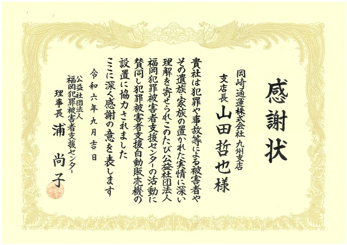 岡崎通運株式会社(本社:愛知県岡崎市、代表取締役:天野保弘)九州支店は犯罪被害者支援につながる寄付型自販機を設置していることに対し、2024年9月20日に公益社団法人福岡犯罪被害者サポートセンター様より感謝状を贈呈いただきました。